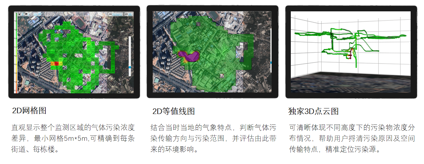 靈嗅可通過(guò)與無(wú)人機(jī)、汽車(chē)等移動(dòng)載具集成,實(shí)現(xiàn)對(duì)更廣闊區(qū)域的地面與空中監(jiān)測(cè),實(shí)時(shí)動(dòng)態(tài)獲取多項(xiàng)空氣污染物的三維濃度分布情況,讓污染分布一目了然,從而快速鎖定氣體污染源的類型、位置與傳輸方向,為環(huán)保部門(mén)大氣防治提供行動(dòng)思路和依據(jù),高效、省時(shí)、節(jié)省人力成本。