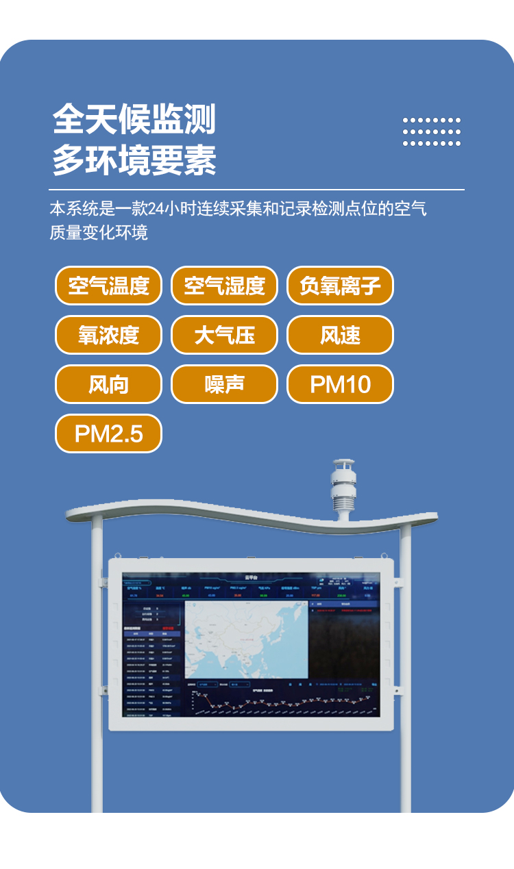 高智能負氧離子監(jiān)測站可全天候監(jiān)測空氣中負氧離子濃度,同時可根據(jù)用戶需求擴展監(jiān)測項目,如:空氣溫度、空氣濕度、PM2.5、PM10、大氣壓力、氧含量、噪聲、風速、風向等氣象要素。傳感器一體化設(shè)計,無機械位移,精度高、使用壽命長