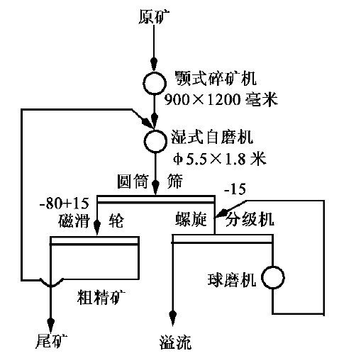 生產(chǎn)初期采用兩毆全閉路半自磨流程醫(yī)圖1(a)。原礦粗碎至350~0毫米,給入濕式自磨機(jī)磨碎,自磨機(jī)與高堰式螺旋分級機(jī)由泥勺機(jī)提升組成閉路。自磨機(jī)排礦經(jīng)圓筒篩過篩后,+10毫米物料返回自磨機(jī),篩下物料進(jìn)螺旋分級機(jī)分級,返砂也返回自磨機(jī),分級溢流細(xì)度為50%~200目左右。分級溢流經(jīng)一段磁力脫水槽脫泥、脫水,并廢棄部分尾礦后,進(jìn)入第二段磨礦。第二段磨礦為溢流型球磨機(jī)與螺旋分級機(jī)組成的預(yù)檢分級磨礦回路,分級溢流細(xì)度為80%~200目,合格溢流進(jìn)磁選選別。兩段閉路自磨流程的主要問題是,兩段磨礦的負(fù)荷不平衡,往往第一段負(fù)荷高,第二段負(fù)荷不足,而且難以調(diào)節(jié);同時(shí),自磨機(jī)中易形成難磨粒級的聚集,致使自磨機(jī)的產(chǎn)量提不高,若加大給礦量,則自磨機(jī)造成“脹肚”。針對上述存在問題,將原流程改為兩段一開路,如圖1(b)。第一段自磨機(jī)開路工作,圓筒篩篩孔改為5毫米,取消了螺旋分級機(jī),篩上產(chǎn)物不再返回自磨機(jī),而給入第二段球磨機(jī)磨碎,篩下產(chǎn)物直接進(jìn)磁力脫水槽和第二磨礦段。自磨機(jī)開路工作后提高了處理能力,第二段磨礦的負(fù)荷也得到提高,兩段磨礦的負(fù)荷趨于平衡。例:某鐵礦兩段半閉路半自磨流程。如圖2所示。