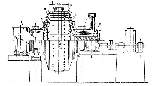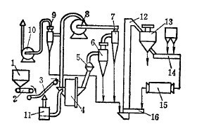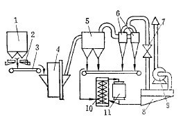 被粉碎的物料在主風(fēng)機(jī)10(主風(fēng)機(jī)的作用是使調(diào)節(jié)好的空氣流在自磨機(jī)和分級機(jī)內(nèi)循環(huán)并運(yùn)輸物料)造成的強(qiáng)大風(fēng)力作用下被連續(xù)排出,沿著管道進(jìn)入沉降箱6進(jìn)行第一次分級,較粗的顆粒便沉降下來。細(xì)小的物料繼續(xù)進(jìn)入旋風(fēng)分離器7,進(jìn)行第二次分級,這時絕大部分細(xì)小物料都沉降。已在沉降箱和旋風(fēng)分離器中沉降的物料靠鎖氣器8間斷排出,貯存在粉礦倉9中,以便進(jìn)行干式磁選。