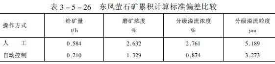我國東風螢石公司浮選廠和首鋼大石河選礦廠磨礦分級自動控制經(jīng)驗表明,采用自動控制系統(tǒng)時,磨礦操作的各項指標的波動范圍均比人工操作?。ㄒ姳?-5-25和表3-5-26)。