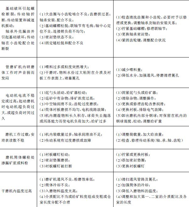 我國選礦廠生產(chǎn)實踐中球磨機易損件的材質(zhì)、使用壽命和設備用量列入表3-5-27中。常見故障、原因和排除方法見表3-5-28。