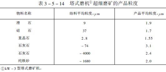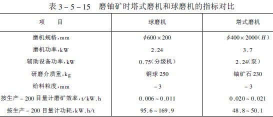表3-5-14示出了利用塔式磨機(jī)磨碎不同物料獲得的產(chǎn)品細(xì)度,表3-5-15列出了利用球磨機(jī)和塔式磨機(jī)磨鈾礦石時的結(jié)果對比,從該試驗結(jié)果可以看出按產(chǎn)生一噸小于200目物料所消耗的電能計,塔式磨機(jī)比球磨機(jī)低一倍以上。