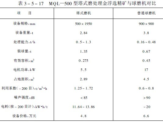 我國有關(guān)單位研制的MQL——500型螺旋攪拌塔式磨機(jī)也分干式、濕式兩種。濕式塔式磨機(jī)于1984年在大石河鐵礦選礦廠進(jìn)行過半工業(yè)試驗,后來在金廠裕金礦用作浮選金礦的再磨,以滿足該廠下步氰化浸出的要求。該廠采用一段塔式磨機(jī)可以將小于350目占64%的金浮選精礦磨細(xì)到小于350目占99.74%,磨機(jī)利用系數(shù)為0.485噸/米3時,電能消耗為13.45千瓦/噸,鋼耗為4.65千克/噸,MQL——500型塔式磨機(jī)與球磨機(jī)工業(yè)試驗指標(biāo)列于表3-5-17中。