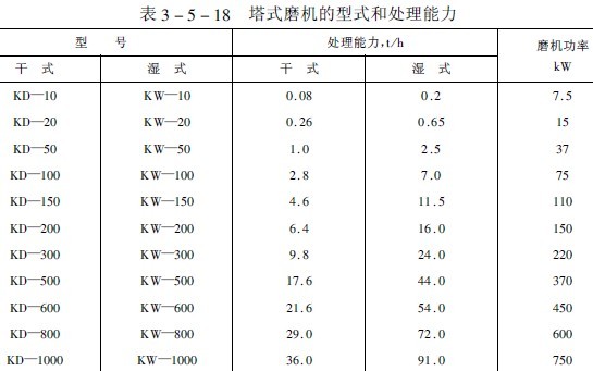 表3-5-18列出了日本生產(chǎn)的塔式磨機(jī)的系列產(chǎn)品,并列出了該系列產(chǎn)品處理給料粒度小于3毫米,產(chǎn)品粒度平均10微米的處理量(噸/時)。