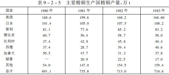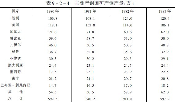 目前世界上采銅國家已有57個(gè),但資本主義世界主要礦產(chǎn)銅生產(chǎn)國約11個(gè)(表9-2-4),其中美國、智利、加拿大和贊比亞為四個(gè)較大產(chǎn)銅國,約占資本主義世界礦產(chǎn)銅總產(chǎn)量的60%左右。除上述四國外,再加扎伊爾、秘魯、菲律賓和澳大利亞,約占資本主義世界礦產(chǎn)銅總量的83%。