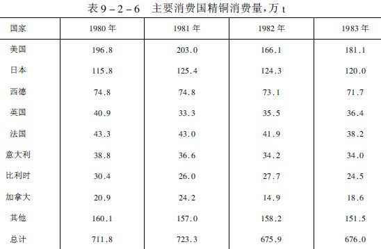 1983年,資本主義各國精銅消費(fèi)量達(dá)680萬噸左右,與1982年的消費(fèi)量相當(dāng)(表9-2-6),其中美國增長15萬噸(9%),英國增長0.9萬噸(2.5%);加拿大增長3.7萬噸(25%)。其他各主要發(fā)達(dá)國家精銅的消費(fèi)量普遍下降。