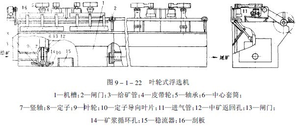 圖9-1-22為葉輪式浮選機(jī)的結(jié)構(gòu)圖。葉輪式浮選機(jī)是由一排木制的或金屬制的長(zhǎng)方形槽子所組成。其間用隔板分成幾個(gè)浮選槽,再由2個(gè)、4個(gè)或6個(gè)浮選槽組成一個(gè)機(jī)組,每臺(tái)浮選機(jī)由幾個(gè)機(jī)組組成。每個(gè)機(jī)組的第一個(gè)槽是吸入槽(帶有給礦管3),其下部是和第二個(gè)槽(無(wú)給礦管)相通的。每個(gè)槽內(nèi)有豎軸7,其下端裝有葉輪9,上端裝有皮帶輪4。葉輪由電動(dòng)機(jī)經(jīng)三角皮帶帶動(dòng)旋轉(zhuǎn)。由于葉輪的旋轉(zhuǎn),在葉輪上面的定子. 下形成負(fù)壓,致使空氣由進(jìn)氣管11進(jìn)入,并形成氣泡。吸入的空氣和由給礦管進(jìn)入的礦漿在葉輪上部混合,并被旋轉(zhuǎn)的葉輪拋向槽體周?chē)?。為了防止礦漿產(chǎn)生渦流,在槽體內(nèi)裝有穩(wěn)流器15———直立翅板。欲浮礦物被氣泡帶至礦漿表面形成礦化泡沫層,用旋轉(zhuǎn)的刮板16將泡沫刮出即得精礦;不浮的礦物和脈石則經(jīng)槽子側(cè)壁上的閘門(mén)2進(jìn)入下一浮選槽內(nèi)。每個(gè)機(jī)組中的礦漿水平可用閘門(mén)2來(lái)調(diào)節(jié)。在豎軸外有和進(jìn)氣管相連的中心套筒6。為了控制吸氣量,在中心套筒的下部開(kāi)有較大的循環(huán)孔12,用閘門(mén)13進(jìn)行控制,同時(shí)還在定子蓋板上布置了許多小孔14來(lái)改變礦漿的內(nèi)循環(huán)。