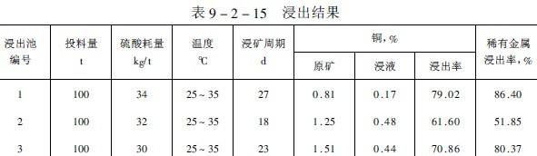 由于尾砂粒度細、難滲濾,故采用浸出池進行生產(chǎn),先加酸化水中和礦石中的堿性脈石,待溶液pH值達2.0左右時,加入含菌高鐵(Fe sup 2+ /sup )的浸礦劑或浸出貧液(指含銅和稀有金屬降低,F(xiàn)e sup 2+ /sup 較高的浸出液)進行循環(huán)浸出,直至浸出液銅、稀有金屬較低為止。然后,加銅稀有金屬含量較低的細菌高鐵液,當浸出液濃度更低時,再用水洗兩三天排料。尾砂浸出時間為二十天,浸出結(jié)果列于表9-2-15。