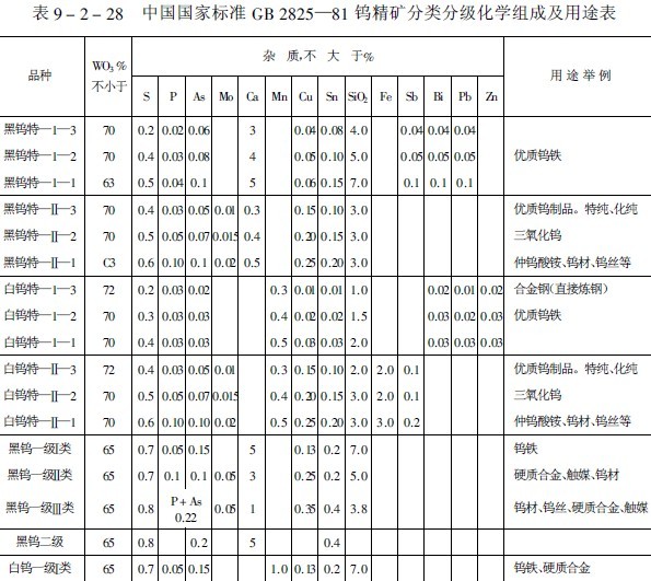 表9-2-29及表9-2-30為蘇聯(lián)國家鎢精礦產(chǎn)品標準,表9-1-31為國外質(zhì)優(yōu)鎢精礦產(chǎn)品標準。