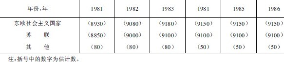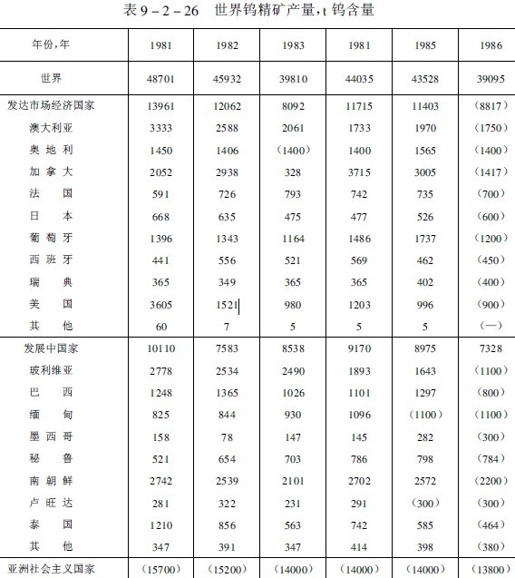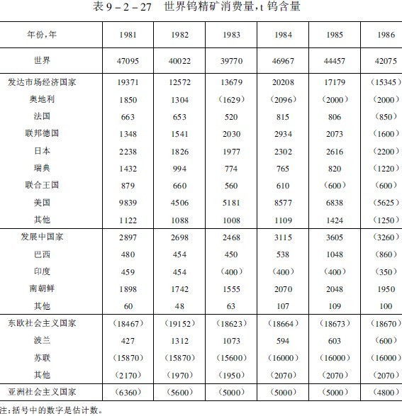 根據(jù)聯(lián)合國(guó)貿(mào)易和發(fā)展會(huì)議商品委員會(huì)鎢委會(huì)1986年11月第18屆會(huì)議報(bào)告資料,近幾年世界鎢精礦的產(chǎn)量和消費(fèi)量分別列于表9-2-26及表9-2-27。