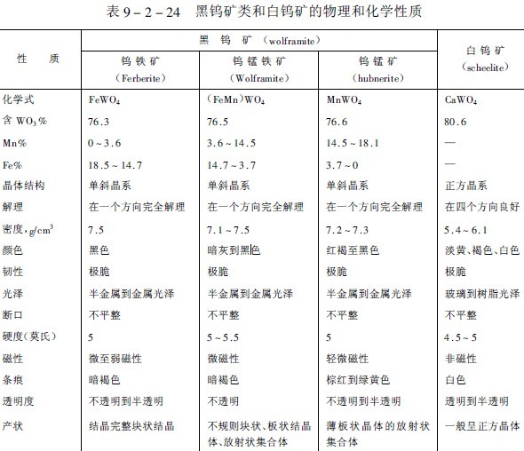 白鎢礦(CaWO sub 4 /sub )是鈣鎢酸鹽,結晶呈正方晶系,鉬可能取代白鎢礦中的鎢,而形成一種類質同象的鉬酸鈣(CaMoO sub 4 /sub )礦。白鎢礦在紫外線輻射感應下,發(fā)出鮮明的藍白色熒光,當?shù)V物中有鉬存在時,會改變熒光的顏色,隨著鉬的含量增加,逐漸由藍色變?yōu)槊咨?,淡黃色或橙色。表9-2-24是黑鎢礦類和白鎢礦的物理和化學性質。