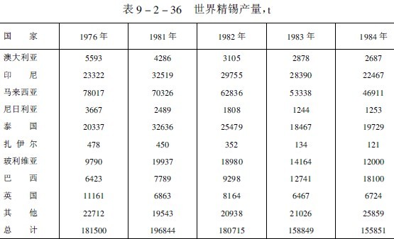 1976年以來(lái),世界錫精礦含錫和精錫的產(chǎn)量列于表9-2-35和表9-2-36(不包括我國(guó)、蘇聯(lián)和東歐各國(guó))