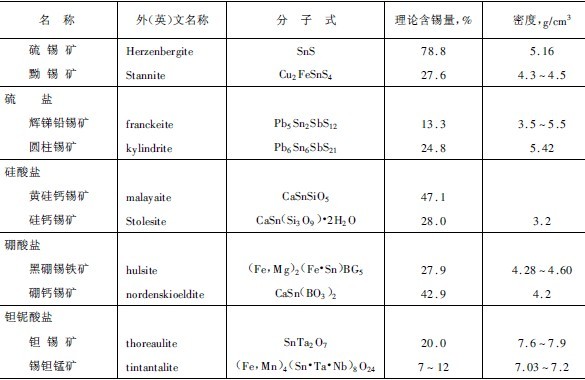目前世界上已發(fā)現(xiàn)的錫礦物達(dá)60多種,包括氧化物、氫氧化物、硫化物、硫酸鹽、硅酸鹽、硼酸鹽、鉭鈮酸鹽以及天然金屬和合金。主要錫礦物及其特性列于表9-2-34。