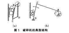 顎式破碎機(jī)兩種典型結(jié)構(gòu)如下圖1所示。圖1-a所示顎式破碎機(jī),由機(jī)架AD、曲軸AB、 動(dòng)顎板BC、肘板CD組成。圖1-b所示的顎式破碎機(jī),曲柄AB帶動(dòng)連桿BC和搖桿CD運(yùn)動(dòng),它與前一類顎式破碎機(jī)雖然采用相同的曲柄搖桿機(jī)構(gòu),但工作原理不同。