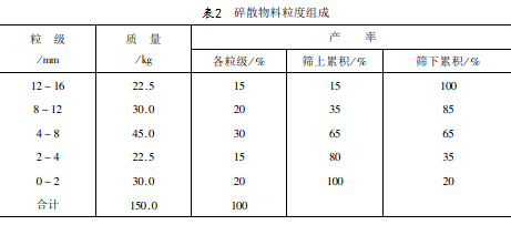 試驗結(jié)果處理的基本內(nèi)容是計算產(chǎn)率。產(chǎn)率分為粒級產(chǎn)率與累積產(chǎn)率,粒級產(chǎn)率是該粒級的質(zhì)量占被篩物料總質(zhì)量的百分率,累積產(chǎn)率又分為篩上累積產(chǎn)率(又叫正累積)及篩下累積產(chǎn)率(又叫負累積)。正累積產(chǎn)率是大于某一篩孔的各粒級產(chǎn)率之和,負累積產(chǎn)率是小于某一篩孔的各粒級產(chǎn)率之和。在計算粒級產(chǎn)率時,“被篩物料總質(zhì)量”可以用各粒級質(zhì)量之和,也可以用原試樣的質(zhì)量,此時把損失量加入較細級別,認(rèn)為篩分時呈灰塵飛揚了。基本的篩分試驗記錄及結(jié)果處理如表2所示。