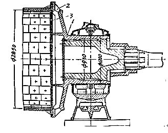2、圖2是一種中心傳動邊緣卸料的裝置。在球磨機端蓋內(nèi)表面和卸料篦板3之間,形成一個環(huán)行空間,在端蓋壁上等距切割橢圓形孔2,物料從此孔卸出,落到外罩下部(圖中外罩未畫出)。